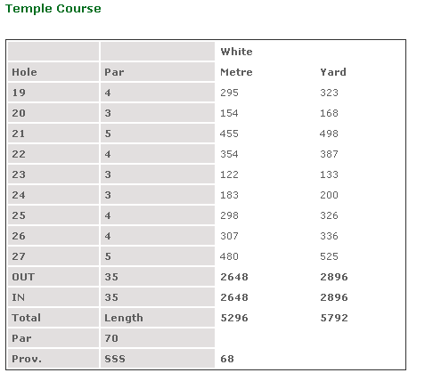 The Temple course(par 70) is 5,960 yards (18 holes) from the medal tees and offers an ideal test of golf. Although shorter than the Park Course, the features are suberb.